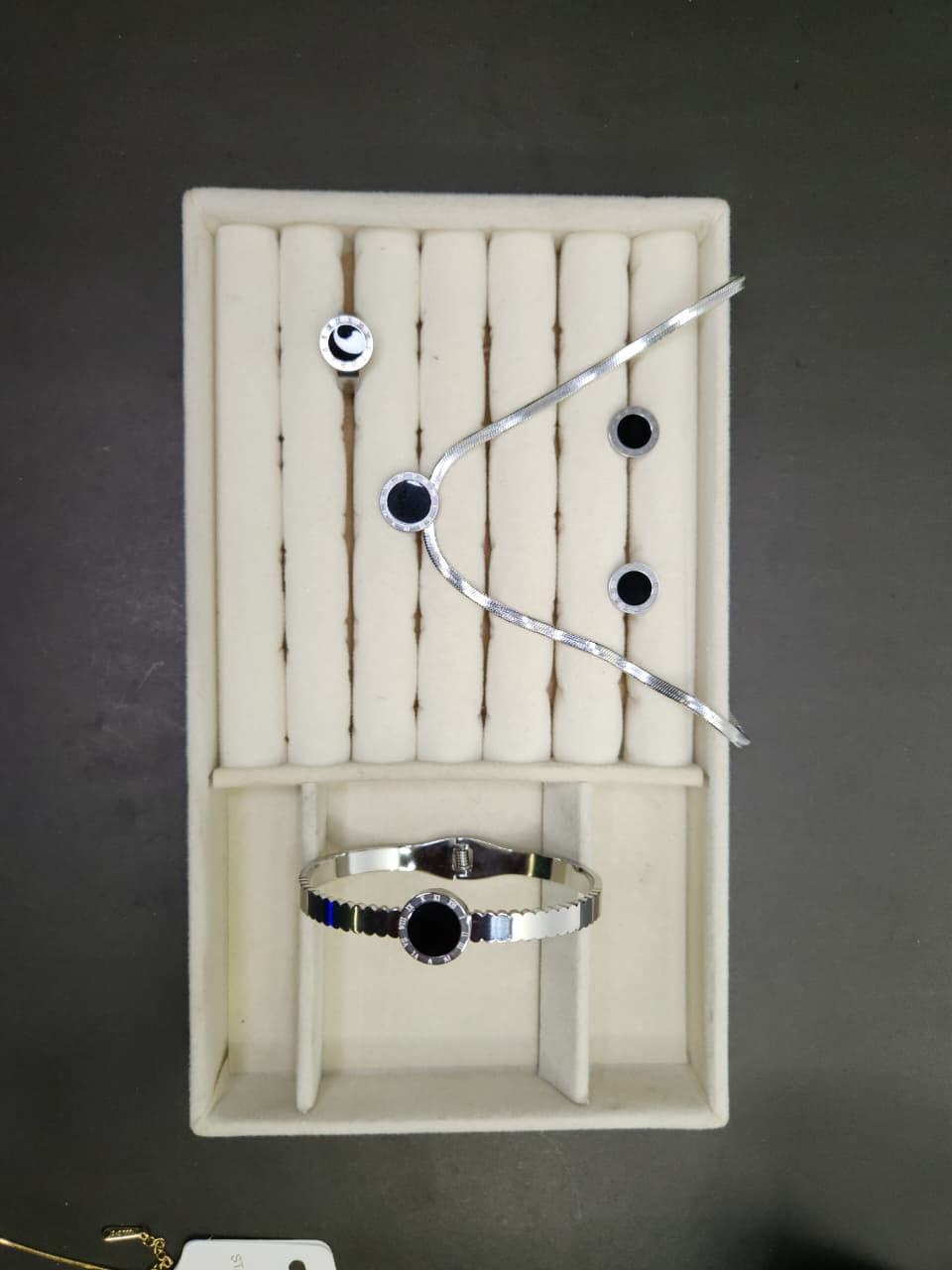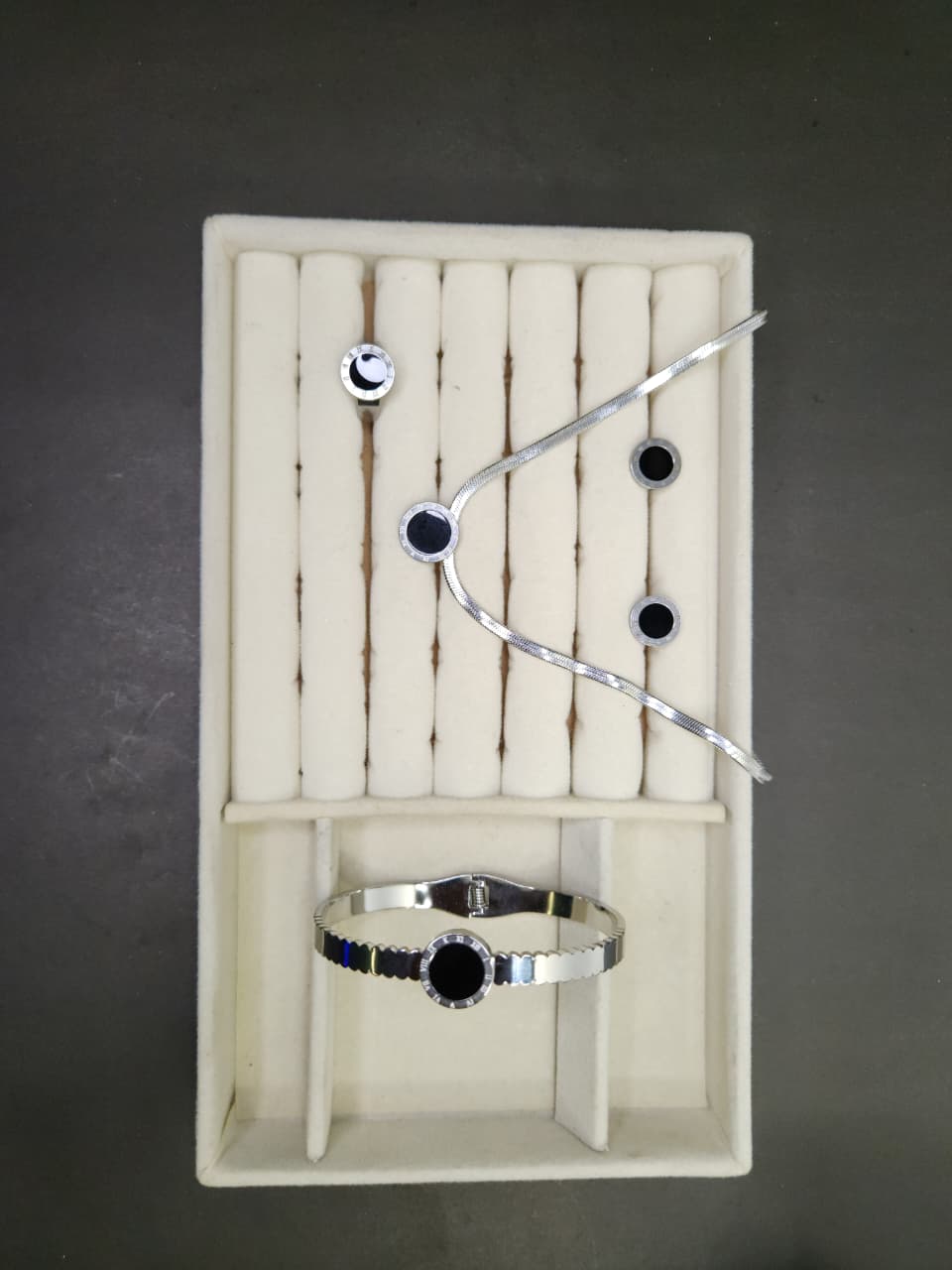 "Make a striking impression with the Midnight Aura Set. Featuring polished silver frames encasing deep black stones, this modern collection exudes sophistication and bold charm. The bracelet, necklace, earrings, and ring blend elegance with a touch of mystery, ideal for evening glamour or contemporary chic styling."