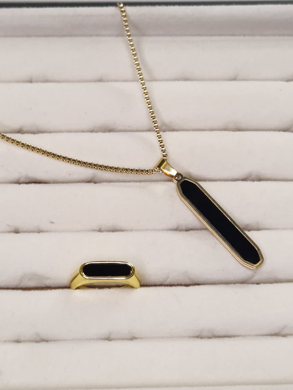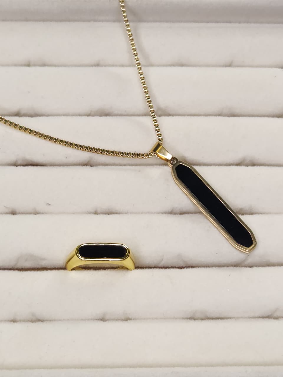 "Refined and commanding, the Noir Elegance Set pairs a bold rectangular black onyx pendant with its matching gold-plated ring. This striking duo balances minimalism with luxury, making it the ideal statement for modern sophistication and timeless style."