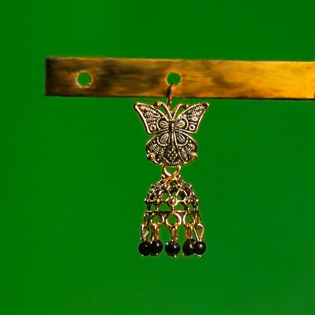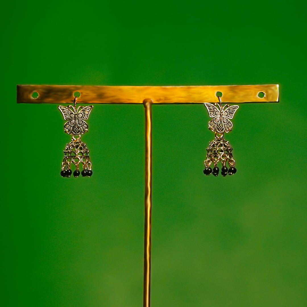 Graceful and unique, these earrings feature intricately designed butterfly tops paired with dangling black bead charms. A perfect mix of elegance and playfulness, they bring a delicate yet bold touch to your look.