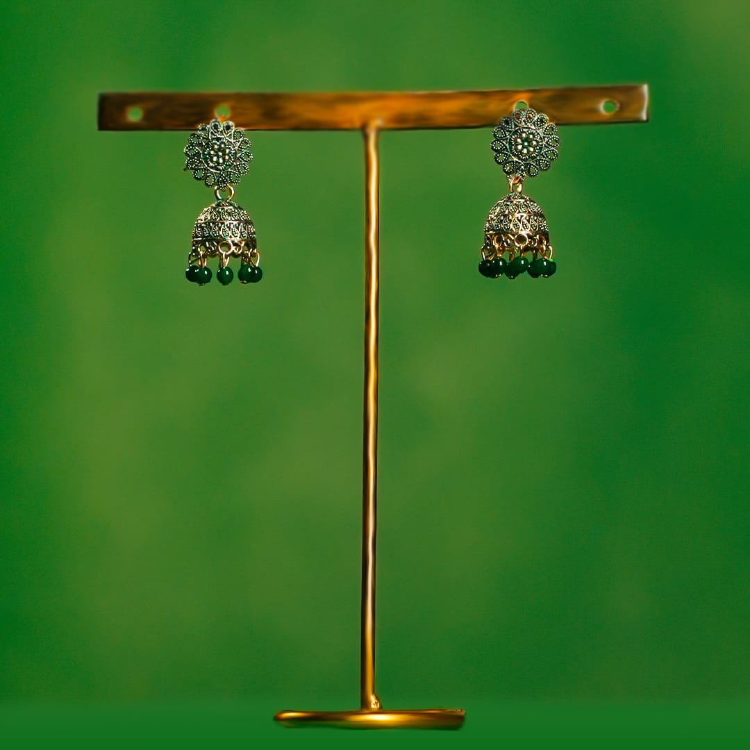 Gracefully designed with intricate golden patterns, this jhumka features deep green bead drops that add a refreshing pop of color. A perfect blend of elegance and tradition, ideal for festive and cultural occasions.