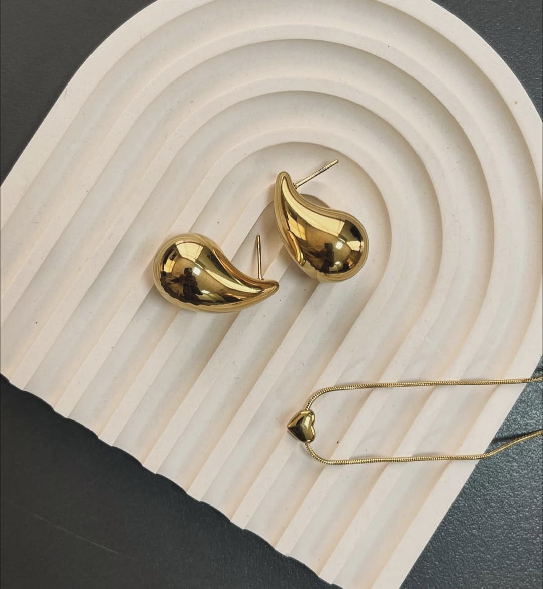 A blend of fluid design and golden glow. These sculpted teardrop earrings and matching pendant bring effortless elegance to every look — simple, modern, and timeless.