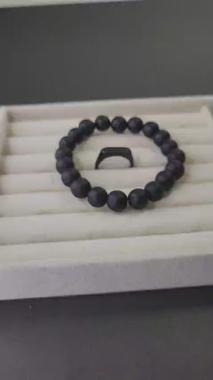 This matte black beaded bracelet with a matching sleek ring is the perfect blend of elegance and masculinity. Designed for a bold yet minimal look, it adds a touch of sophistication and confidence to any outfit, whether casual or formal.