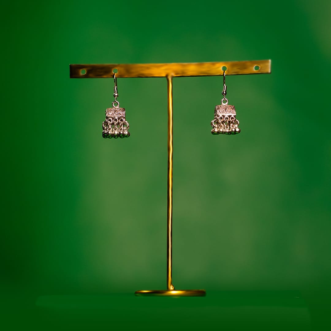 Delicate and artistic, this silver-toned earring features intricate carvings and dangling ghungroo beads that create a soft, graceful jingle. Perfect for adding a touch of cultural elegance to festive outfits or casual ethnic wear.