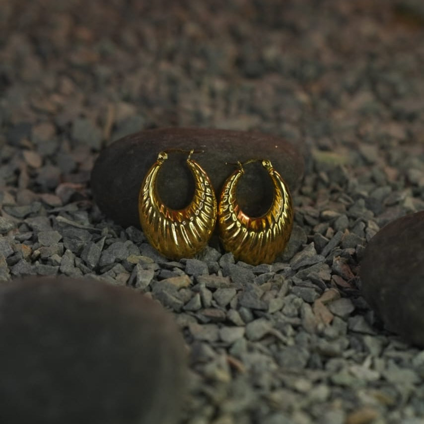 "Make a statement with the Lunar Glow Hoops, crafted in a radiant gold finish with bold crescent curves and intricate ridged detailing. These earrings exude a unique blend of timeless tradition and contemporary style, perfect for elevating any look with effortless grace."